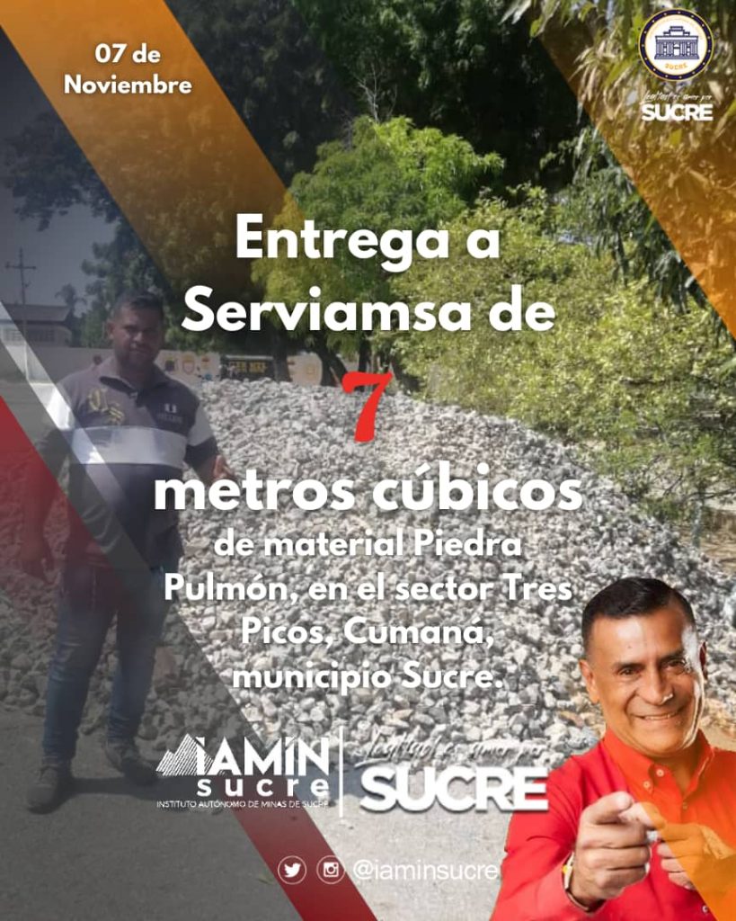 Este 07 de noviembre, fueron entregados a «Serviamsa» 7 metros cúbicos de material «Piedra Pulmón», provenientes de la cantera «Materiales y Suministros C.V.S C.A», como donativo de la empresa coordinado a través del IAMIN Sucre, para el sector «Tres Picos», Cumaná, municipio Sucre.