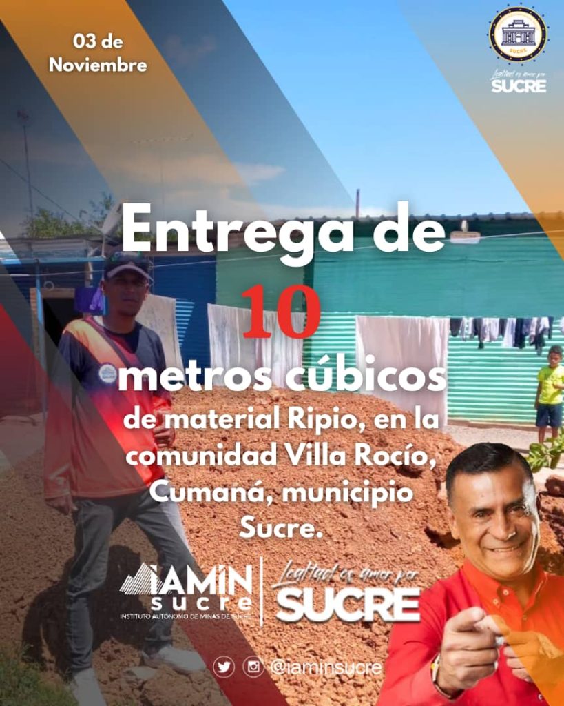 Este 03 de noviembre, fueron entregados 10 metros cúbicos de material «Ripio», provenientes de la cantera «Kaskote C.A», como pago de Regalías Mineras en especie al IAMIN Sucre, en la comunidad «Villa Rocío», Cumaná, municipio Sucre, para la ciudadana Yolenny Galantón.